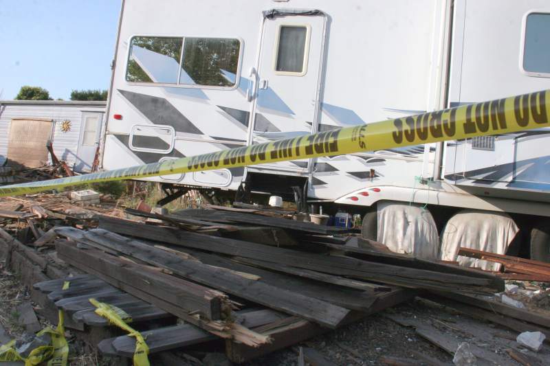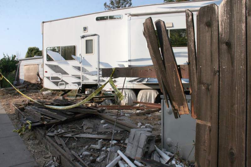 The pickup continued to crash through the redwood fence, knocking down a brick pillar as it did so, then striking two mobile homes.